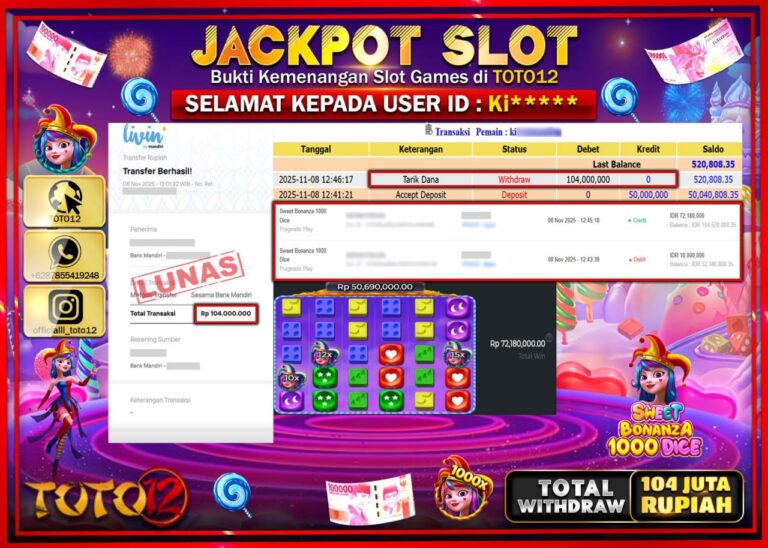 Selamat kepada Member Kami Ki****** Telah Jackpot dan berhasil mendapatkan kemenangan besar pada permainan JACKPOT SLOT GAME (SWEET BONANZA 1000 DICE) Dengan Kemenangan Sebesar Rp.104.000.000 –. Setelah mengisi Fomulir Withdraw dengan Kurang waktu 1-2 Menit Dana sudah kami Trasnfer kepada Pemilik Userid dan dana sudah dapat di cairkan oleh pemenang. Bukti Pembayaran yang TOTO12 berikan merupakan…