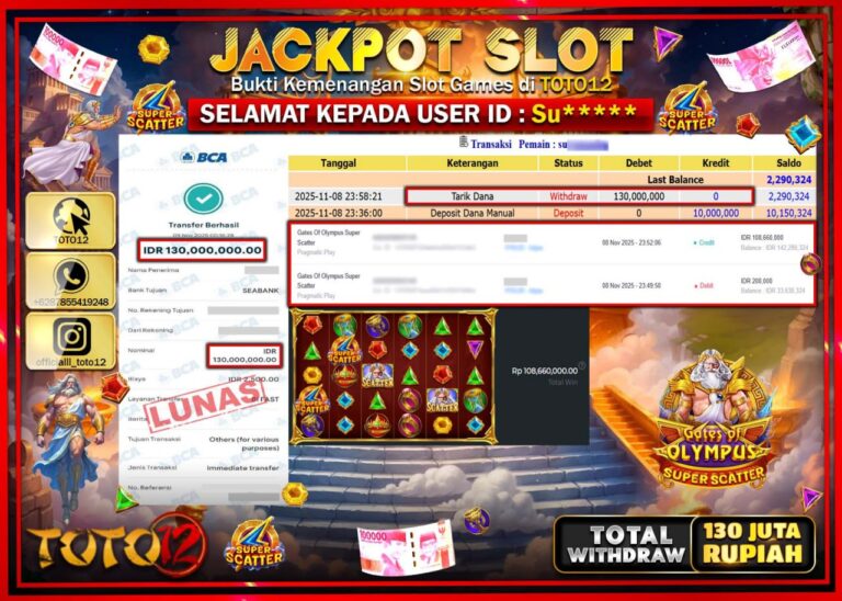 Selamat kepada Member Kami Su****** Telah Jackpot dan berhasil mendapatkan kemenangan besar pada permainan JACKPOT SLOT GAME (GATES OF OLYMPUS SUPER SCATTER) Dengan Kemenangan Sebesar Rp.130.000.000 –. Setelah mengisi Fomulir Withdraw dengan Kurang waktu 1-2 Menit Dana sudah kami Trasnfer kepada Pemilik Userid dan dana sudah dapat di cairkan oleh pemenang. Bukti Pembayaran yang TOTO12 berikan…