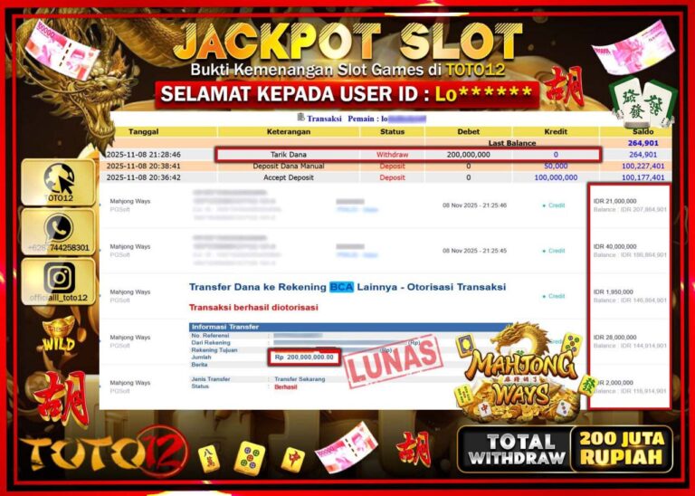 Selamat kepada Member Kami Lo****** Telah Jackpot dan berhasil mendapatkan kemenangan besar pada permainan JACKPOT SLOT GAME (MAHJONG WAYS) Dengan Kemenangan Sebesar Rp.200.000.000 –. Setelah mengisi Fomulir Withdraw dengan Kurang waktu 1-2 Menit Dana sudah kami Trasnfer kepada Pemilik Userid dan dana sudah dapat di cairkan oleh pemenang. Bukti Pembayaran yang TOTO12 berikan merupakan Bukti Pembayaran…