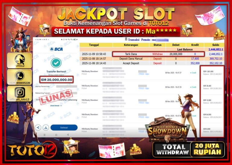 Selamat kepada Member Kami Ma****** Telah Jackpot dan berhasil mendapatkan kemenangan besar pada permainan JACKPOT SLOT GAME (WILD BOUNTY SHOWDOWN) Dengan Kemenangan Sebesar Rp.20.000.000 –. Setelah mengisi Fomulir Withdraw dengan Kurang waktu 1-2 Menit Dana sudah kami Trasnfer kepada Pemilik Userid dan dana sudah dapat di cairkan oleh pemenang. Bukti Pembayaran yang TOTO12 berikan merupakan Bukti…