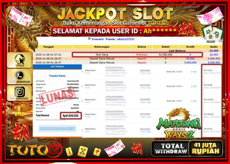 Selamat kepada Member Kami Ah****** Telah Jackpot dan berhasil mendapatkan kemenangan besar pada permainan JACKPOT SLOT GAME (MAHJONG WAYS 2) Dengan Kemenangan Sebesar Rp.41.000.000 –. Setelah mengisi Fomulir Withdraw dengan Kurang waktu 1-2 Menit Dana sudah kami Trasnfer kepada Pemilik Userid dan dana sudah dapat di cairkan oleh pemenang. Bukti Pembayaran yang TOTO12 berikan merupakan Bukti…