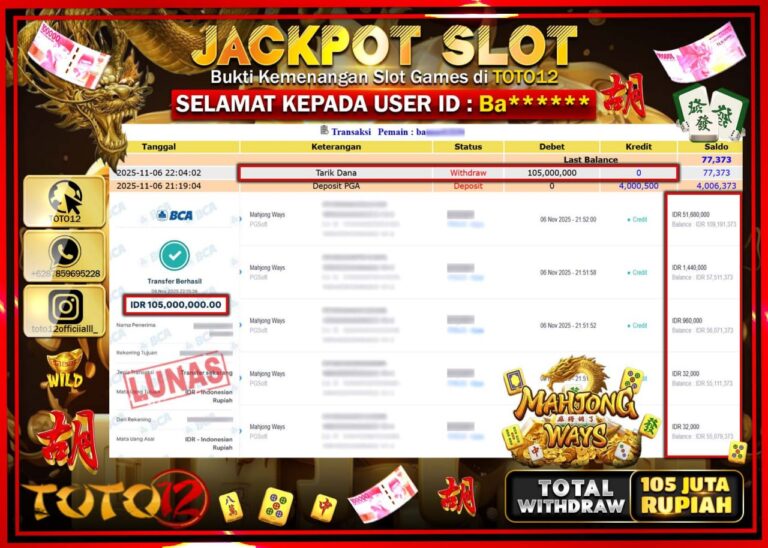 Selamat kepada Member Kami Ba****** Telah Jackpot dan berhasil mendapatkan kemenangan besar pada permainan JACKPOT SLOT GAME (MAHJONG WAYS) Dengan Kemenangan Sebesar Rp.105.000.000 –. Setelah mengisi Fomulir Withdraw dengan Kurang waktu 1-2 Menit Dana sudah kami Trasnfer kepada Pemilik Userid dan dana sudah dapat di cairkan oleh pemenang. Bukti Pembayaran yang TOTO12 berikan merupakan Bukti Pembayaran…