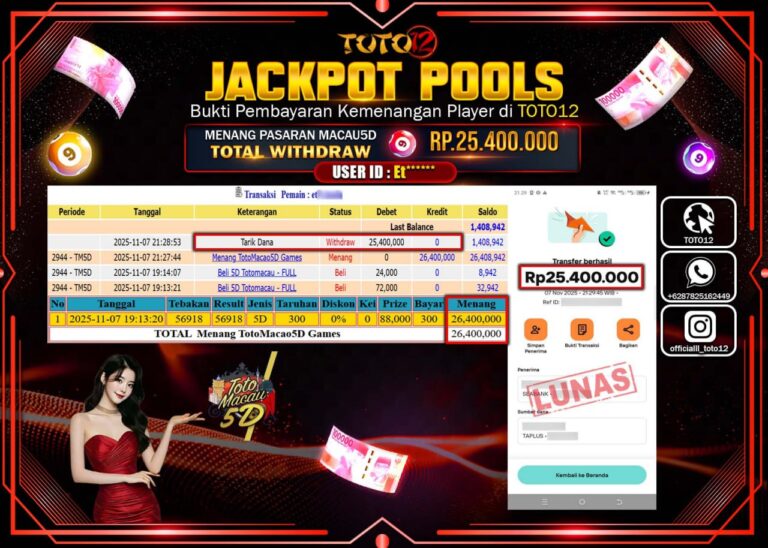 Selamat kepada Member Kami Et****** Telah Jackpot dan berhasil mendapatkan kemenangan besar pada permainan JACKPOT POOLS PASARAN (MACAU5D) Dengan Kemenangan Sebesar Rp.25.400.000 –. Setelah mengisi Fomulir Withdraw dengan Kurang waktu 1-2 Menit Dana sudah kami Trasnfer kepada Pemilik Userid dan dana sudah dapat di cairkan oleh pemenang. Bukti Pembayaran yang TOTO12 berikan merupakan Bukti Pembayaran yang …