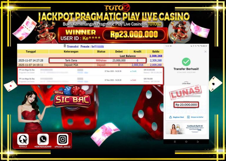 Selamat kepada Member Kami Ke****** Telah Jackpot dan berhasil mendapatkan kemenangan besar pada permainan JACKPOT PRAGMATIC PLAY LIVE CASINO (MEGA SIC BAC) Dengan Kemenangan Sebesar Rp.23.000.000 –. Setelah mengisi Fomulir Withdraw dengan Kurang waktu 1-2 Menit Dana sudah kami Trasnfer kepada Pemilik Userid dan dana sudah dapat di cairkan oleh pemenang. Bukti Pembayaran yang TOTO12 berikan…