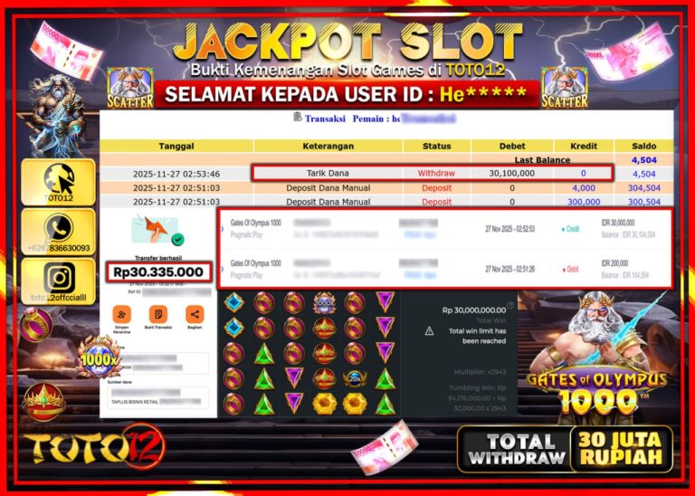 Selamat kepada Member Kami He****** Telah Jackpot dan berhasil mendapatkan kemenangan besar pada permainan JACKPOT SLOT GAME (GATES OF OLYMPUS 1000) Dengan Kemenangan Sebesar Rp.30.100.000 –. Setelah mengisi Fomulir Withdraw dengan Kurang waktu 1-2 Menit Dana sudah kami Trasnfer kepada Pemilik Userid dan dana sudah dapat di cairkan oleh pemenang. Bukti Pembayaran yang TOTO12 berikan merupakan…