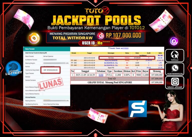 Selamat kepada Member Kami Me****** Telah Jackpot dan berhasil mendapatkan kemenangan besar pada permainan JACKPOT POOLS PASARAN (SINGAPORE) Dengan Kemenangan Sebesar Rp.107.000.000 –. Setelah mengisi Fomulir Withdraw dengan Kurang waktu 1-2 Menit Dana sudah kami Trasnfer kepada Pemilik Userid dan dana sudah dapat di cairkan oleh pemenang. Bukti Pembayaran yang TOTO12 berikan merupakan Bukti Pembayaran yang …