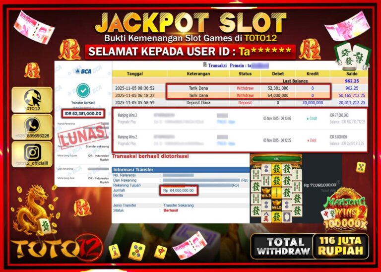 Selamat kepada Member Kami Ta****** Telah Jackpot dan berhasil mendapatkan kemenangan besar pada permainan JACKPOT SLOT GAME (MAHJONG WINS 2) Dengan Kemenangan Sebesar Rp.116.381.000 –. Setelah mengisi Fomulir Withdraw dengan Kurang waktu 1-2 Menit Dana sudah kami Trasnfer kepada Pemilik Userid dan dana sudah dapat di cairkan oleh pemenang. Bukti Pembayaran yang TOTO12 berikan merupakan Bukti…