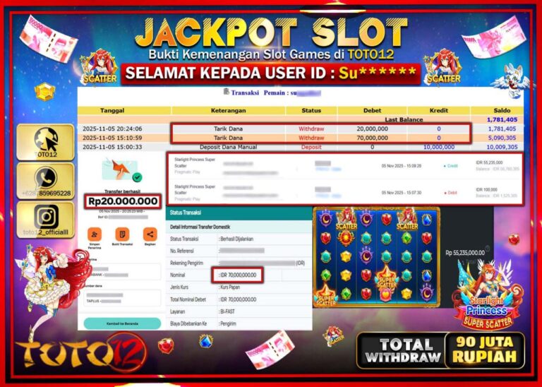 Selamat kepada Member Kami Su****** Telah Jackpot dan berhasil mendapatkan kemenangan besar pada permainan JACKPOT SLOT GAME (STARLIGHT PRINCESS SUPER SCATTER) Dengan Kemenangan Sebesar Rp.90.000.000 –. Setelah mengisi Fomulir Withdraw dengan Kurang waktu 1-2 Menit Dana sudah kami Trasnfer kepada Pemilik Userid dan dana sudah dapat di cairkan oleh pemenang. Bukti Pembayaran yang TOTO12 berikan merupakan…