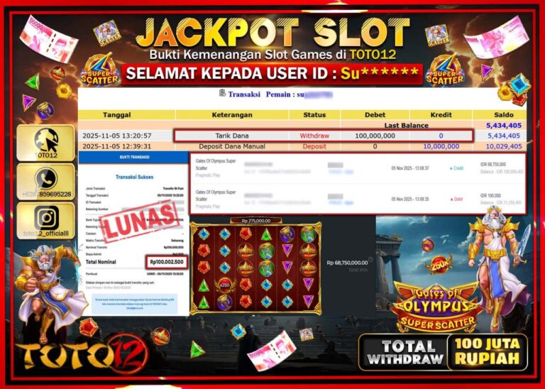 Selamat kepada Member Kami Su****** Telah Jackpot dan berhasil mendapatkan kemenangan besar pada permainan JACKPOT SLOT GAME (GATES OF OLYMPUS SUPER SCATTER) Dengan Kemenangan Sebesar Rp.100.000.000 –. Setelah mengisi Fomulir Withdraw dengan Kurang waktu 1-2 Menit Dana sudah kami Trasnfer kepada Pemilik Userid dan dana sudah dapat di cairkan oleh pemenang. Bukti Pembayaran yang TOTO12 berikan…
