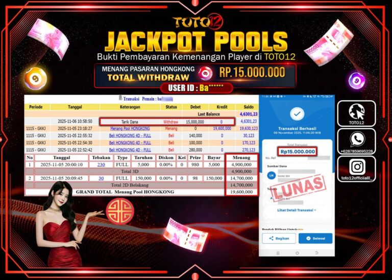 Selamat kepada Member Kami Ba****** Telah Jackpot dan berhasil mendapatkan kemenangan besar pada permainan JACKPOT POOLS PASARAN (HONGKONG) Dengan Kemenangan Sebesar Rp.15.000.000 –. Setelah mengisi Fomulir Withdraw dengan Kurang waktu 1-2 Menit Dana sudah kami Trasnfer kepada Pemilik Userid dan dana sudah dapat di cairkan oleh pemenang. Bukti Pembayaran yang TOTO12 berikan merupakan Bukti Pembayaran yang …