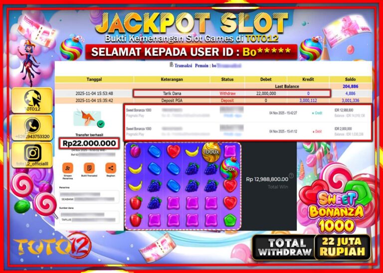 Selamat kepada Member Kami Bo****** Telah Jackpot dan berhasil mendapatkan kemenangan besar pada permainan JACKPOT SLOT GAME (SWEET BONANZA 1000) Dengan Kemenangan Sebesar Rp.22.000.000 –. Setelah mengisi Fomulir Withdraw dengan Kurang waktu 1-2 Menit Dana sudah kami Trasnfer kepada Pemilik Userid dan dana sudah dapat di cairkan oleh pemenang. Bukti Pembayaran yang TOTO12 berikan merupakan Bukti…
