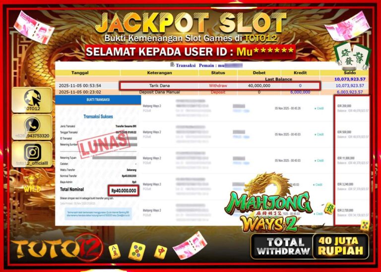 Selamat kepada Member Kami Mu****** Telah Jackpot dan berhasil mendapatkan kemenangan besar pada permainan JACKPOT SLOT GAME (MAHJONG WAYS 2) Dengan Kemenangan Sebesar Rp.40.000.000 –. Setelah mengisi Fomulir Withdraw dengan Kurang waktu 1-2 Menit Dana sudah kami Trasnfer kepada Pemilik Userid dan dana sudah dapat di cairkan oleh pemenang. Bukti Pembayaran yang TOTO12 berikan merupakan Bukti…