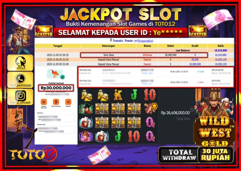 Selamat kepada Member Kami Ya****** Telah Jackpot dan berhasil mendapatkan kemenangan besar pada permainan JACKPOT SLOT GAME (WILD WEST GOLD) Dengan Kemenangan Sebesar Rp.30.000.000 –. Setelah mengisi Fomulir Withdraw dengan Kurang waktu 1-2 Menit Dana sudah kami Trasnfer kepada Pemilik Userid dan dana sudah dapat di cairkan oleh pemenang. Bukti Pembayaran yang TOTO12 berikan merupakan Bukti…