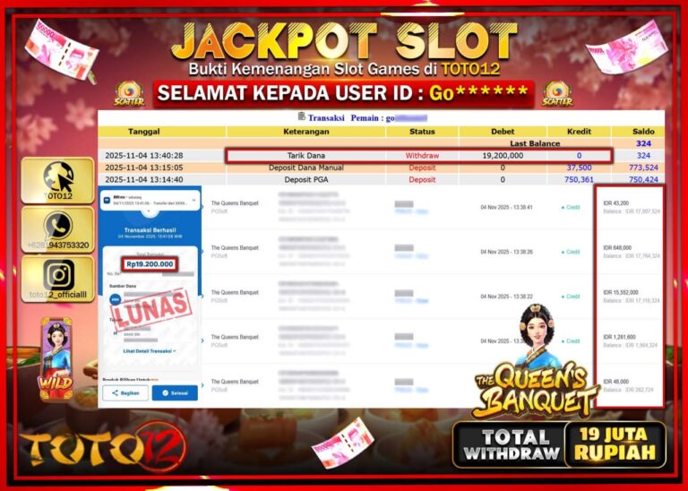 Selamat kepada Member Kami Go****** Telah Jackpot dan berhasil mendapatkan kemenangan besar pada permainan JACKPOT SLOT GAME (THE QUEENS BANQUET) Dengan Kemenangan Sebesar Rp.19.200.000 –. Setelah mengisi Fomulir Withdraw dengan Kurang waktu 1-2 Menit Dana sudah kami Trasnfer kepada Pemilik Userid dan dana sudah dapat di cairkan oleh pemenang. Bukti Pembayaran yang TOTO12 berikan merupakan Bukti…