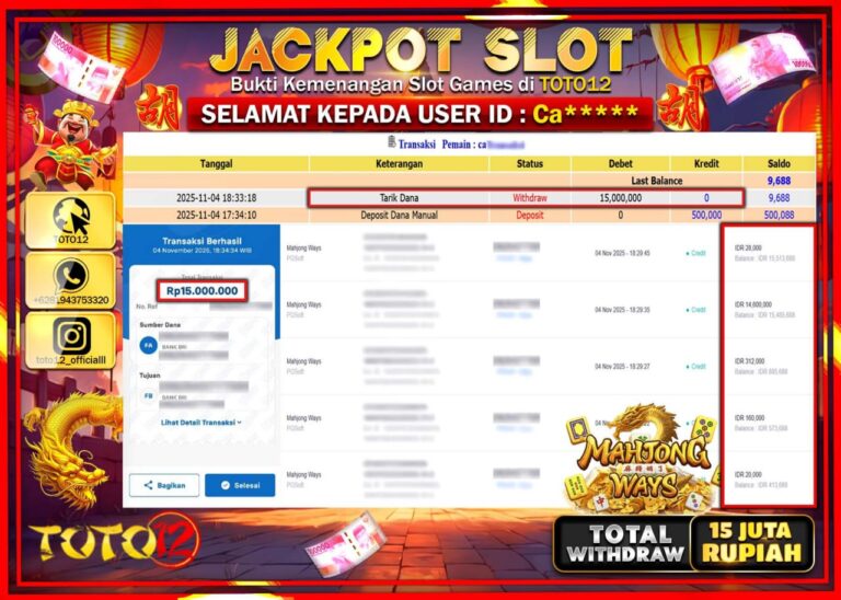 Selamat kepada Member Kami Ca****** Telah Jackpot dan berhasil mendapatkan kemenangan besar pada permainan JACKPOT SLOT GAME (MAHJONG WAYS) Dengan Kemenangan Sebesar Rp.15.000.000 –. Setelah mengisi Fomulir Withdraw dengan Kurang waktu 1-2 Menit Dana sudah kami Trasnfer kepada Pemilik Userid dan dana sudah dapat di cairkan oleh pemenang. Bukti Pembayaran yang TOTO12 berikan merupakan Bukti Pembayaran…