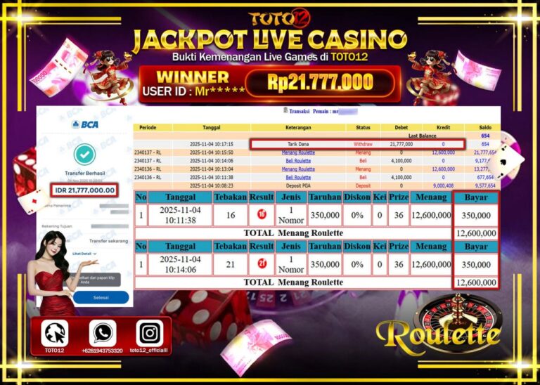 Selamat kepada Member Kami Mr****** Telah Jackpot dan berhasil mendapatkan kemenangan besar pada permainan JACKPOT LIVE CASINO (ROULETTE) Dengan Kemenangan Sebesar Rp.21.777.000 –. Setelah mengisi Fomulir Withdraw dengan Kurang waktu 1-2 Menit Dana sudah kami Trasnfer kepada Pemilik Userid dan dana sudah dapat di cairkan oleh pemenang. Bukti Pembayaran yang TOTO12 berikan merupakan Bukti Pembayaran yang …