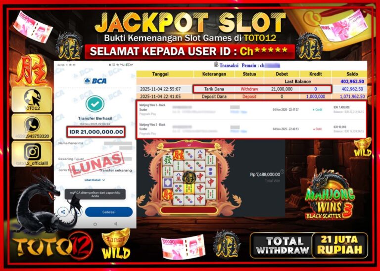 Selamat kepada Member Kami Ch****** Telah Jackpot dan berhasil mendapatkan kemenangan besar pada permainan JACKPOT SLOT GAME (MAHJONG WINS 3 BLACK SCATTER) Dengan Kemenangan Sebesar Rp.21.000.000 –. Setelah mengisi Fomulir Withdraw dengan Kurang waktu 1-2 Menit Dana sudah kami Trasnfer kepada Pemilik Userid dan dana sudah dapat di cairkan oleh pemenang. Bukti Pembayaran yang TOTO12 berikan…
