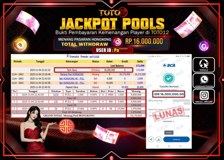Selamat kepada Member Kami Pa****** Telah Jackpot dan berhasil mendapatkan kemenangan besar pada permainan JACKPOT POOLS PASARAN (HONGKONG) Dengan Kemenangan Sebesar Rp.16.000.000 –. Setelah mengisi Fomulir Withdraw dengan Kurang waktu 1-2 Menit Dana sudah kami Trasnfer kepada Pemilik Userid dan dana sudah dapat di cairkan oleh pemenang. Bukti Pembayaran yang TOTO12 berikan merupakan Bukti Pembayaran yang …
