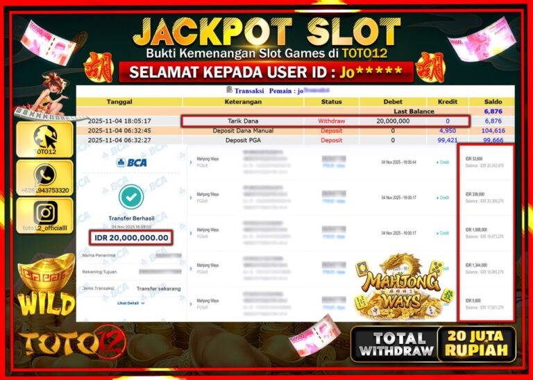 Selamat kepada Member Kami Jo****** Telah Jackpot dan berhasil mendapatkan kemenangan besar pada permainan JACKPOT SLOT GAME (MAHJONG WAYS) Dengan Kemenangan Sebesar Rp.20.000.000 –. Setelah mengisi Fomulir Withdraw dengan Kurang waktu 1-2 Menit Dana sudah kami Trasnfer kepada Pemilik Userid dan dana sudah dapat di cairkan oleh pemenang. Bukti Pembayaran yang TOTO12 berikan merupakan Bukti Pembayaran…
