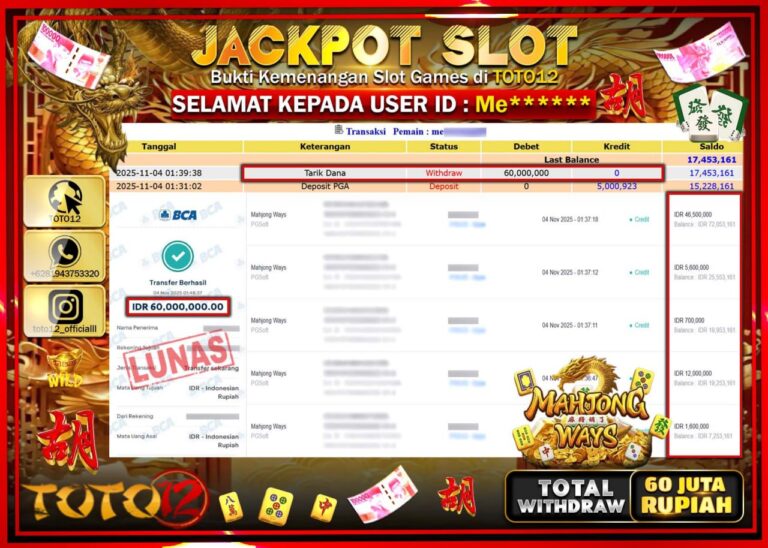 Selamat kepada Member Kami Me****** Telah Jackpot dan berhasil mendapatkan kemenangan besar pada permainan JACKPOT SLOT GAME (MAHJONG WAYS) Dengan Kemenangan Sebesar Rp.60.000.000 –. Setelah mengisi Fomulir Withdraw dengan Kurang waktu 1-2 Menit Dana sudah kami Trasnfer kepada Pemilik Userid dan dana sudah dapat di cairkan oleh pemenang. Bukti Pembayaran yang TOTO12 berikan merupakan Bukti Pembayaran…