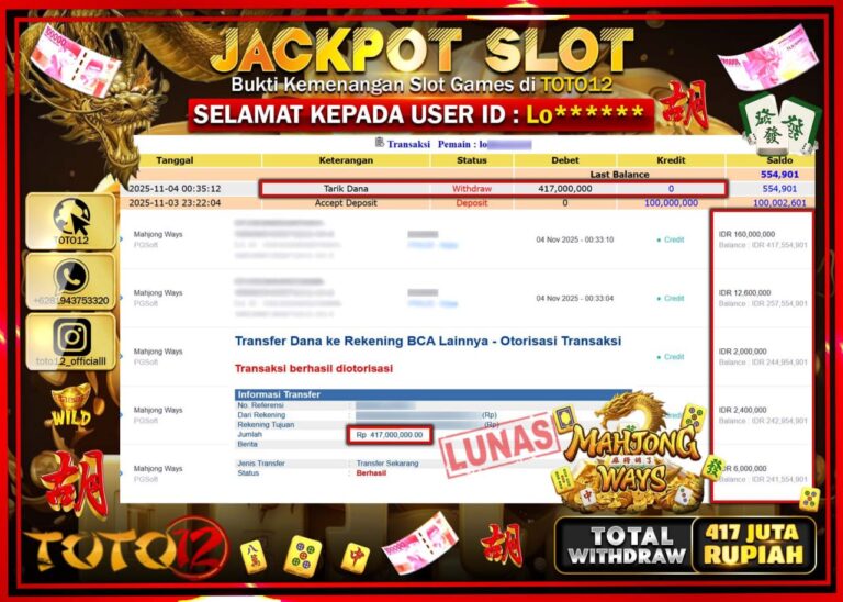 Selamat kepada Member Kami Lo****** Telah Jackpot dan berhasil mendapatkan kemenangan besar pada permainan JACKPOT SLOT GAME (MAHJONG WAYS) Dengan Kemenangan Sebesar Rp.417.000.000 –. Setelah mengisi Fomulir Withdraw dengan Kurang waktu 1-2 Menit Dana sudah kami Trasnfer kepada Pemilik Userid dan dana sudah dapat di cairkan oleh pemenang. Bukti Pembayaran yang TOTO12 berikan merupakan Bukti Pembayaran…
