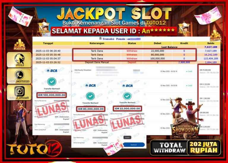 Selamat kepada Member Kami An****** Telah Jackpot dan berhasil mendapatkan kemenangan besar pada permainan JACKPOT SLOT GAME (WILD BOUNTY SHOWDOWN) Dengan Kemenangan Sebesar Rp.202.000.000 –. Setelah mengisi Fomulir Withdraw dengan Kurang waktu 1-2 Menit Dana sudah kami Trasnfer kepada Pemilik Userid dan dana sudah dapat di cairkan oleh pemenang. Bukti Pembayaran yang TOTO12 berikan merupakan Bukti…