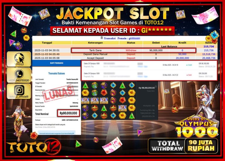 Selamat kepada Member Kami Gi****** Telah Jackpot dan berhasil mendapatkan kemenangan besar pada permainan JACKPOT SLOT GAME (GATES OF OLYMPUS 1000) Dengan Kemenangan Sebesar Rp.90.000.000 –. Setelah mengisi Fomulir Withdraw dengan Kurang waktu 1-2 Menit Dana sudah kami Trasnfer kepada Pemilik Userid dan dana sudah dapat di cairkan oleh pemenang. Bukti Pembayaran yang TOTO12 berikan merupakan…