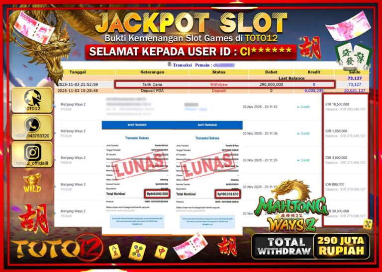 Selamat kepada Member Kami Ci****** Telah Jackpot dan berhasil mendapatkan kemenangan besar pada permainan JACKPOT SLOT GAME (MAHJONG WAYS 2) Dengan Kemenangan Sebesar Rp.290.000.000 –. Setelah mengisi Fomulir Withdraw dengan Kurang waktu 1-2 Menit Dana sudah kami Trasnfer kepada Pemilik Userid dan dana sudah dapat di cairkan oleh pemenang. Bukti Pembayaran yang TOTO12 berikan merupakan Bukti…