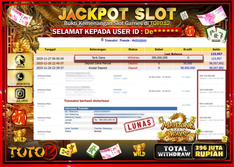Selamat kepada Member Kami De****** Telah Jackpot dan berhasil mendapatkan kemenangan besar pada permainan JACKPOT SLOT GAME (MAHJONG WAYS) Dengan Kemenangan Sebesar Rp.396.000.000 –. Setelah mengisi Fomulir Withdraw dengan Kurang waktu 1-2 Menit Dana sudah kami Trasnfer kepada Pemilik Userid dan dana sudah dapat di cairkan oleh pemenang. Bukti Pembayaran yang TOTO12 berikan merupakan Bukti Pembayaran…