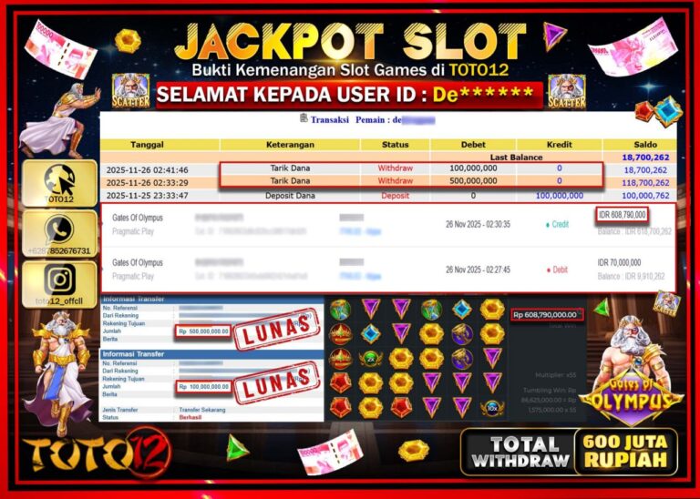Selamat kepada Member Kami De****** Telah Jackpot dan berhasil mendapatkan kemenangan besar pada permainan JACKPOT SLOT GAME (GATES OF OLYMPUS) Dengan Kemenangan Sebesar Rp.600.000.000 –. Setelah mengisi Fomulir Withdraw dengan Kurang waktu 1-2 Menit Dana sudah kami Trasnfer kepada Pemilik Userid dan dana sudah dapat di cairkan oleh pemenang. Bukti Pembayaran yang TOTO12 berikan merupakan Bukti…