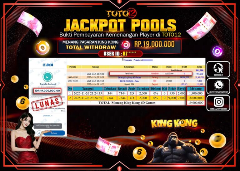 Selamat kepada Member Kami Ri****** Telah Jackpot dan berhasil mendapatkan kemenangan besar pada permainan JACKPOT POOLS PASARAN (KING KONG) Dengan Kemenangan Sebesar Rp.19.000.000 –. Setelah mengisi Fomulir Withdraw dengan Kurang waktu 1-2 Menit Dana sudah kami Trasnfer kepada Pemilik Userid dan dana sudah dapat di cairkan oleh pemenang. Bukti Pembayaran yang TOTO12 berikan merupakan Bukti Pembayaran…