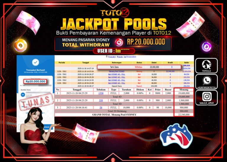 Selamat kepada Member Kami Im****** Telah Jackpot dan berhasil mendapatkan kemenangan besar pada permainan JACKPOT POOLS PASARAN (SYDNEY) Dengan Kemenangan Sebesar Rp.20.000.000 –. Setelah mengisi Fomulir Withdraw dengan Kurang waktu 1-2 Menit Dana sudah kami Trasnfer kepada Pemilik Userid dan dana sudah dapat di cairkan oleh pemenang. Bukti Pembayaran yang TOTO12 berikan merupakan Bukti Pembayaran yang SAH…