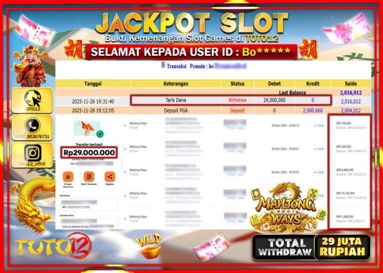Selamat kepada Member Kami Bo****** Telah Jackpot dan berhasil mendapatkan kemenangan besar pada permainan JACKPOT SLOT GAME (MAHJONG WAYS) Dengan Kemenangan Sebesar Rp.29.000.000 –. Setelah mengisi Fomulir Withdraw dengan Kurang waktu 1-2 Menit Dana sudah kami Trasnfer kepada Pemilik Userid dan dana sudah dapat di cairkan oleh pemenang. Bukti Pembayaran yang TOTO12 berikan merupakan Bukti Pembayaran…