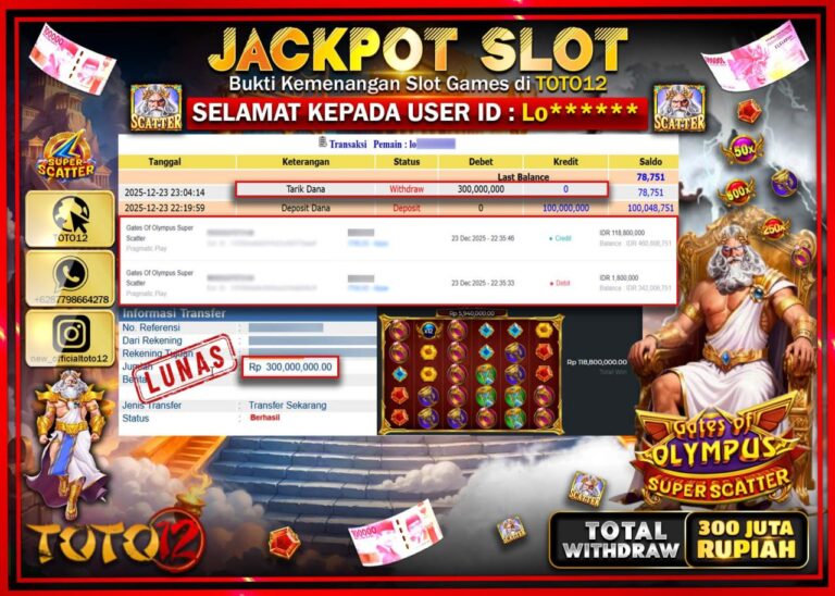 Selamat kepada Member Kami Lo****** Telah Jackpot dan berhasil mendapatkan kemenangan besar pada permainan JACKPOT SLOT GAME (GATES OF OLYMPUS SUPER SCATTER) Dengan Kemenangan Sebesar Rp.300.000.000 –. Setelah mengisi Fomulir Withdraw dengan Kurang waktu 1-2 Menit Dana sudah kami Trasnfer kepada Pemilik Userid dan dana sudah dapat di cairkan oleh pemenang. Bukti Pembayaran yang TOTO12 berikan…