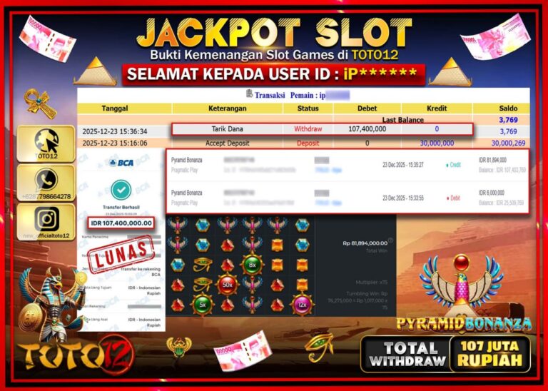 Selamat kepada Member Kami Ip****** Telah Jackpot dan berhasil mendapatkan kemenangan besar pada permainan JACKPOT SLOT GAME (PYRAMID BONANZA) Dengan Kemenangan Sebesar Rp.107.400.000 –. Setelah mengisi Fomulir Withdraw dengan Kurang waktu 1-2 Menit Dana sudah kami Trasnfer kepada Pemilik Userid dan dana sudah dapat di cairkan oleh pemenang. Bukti Pembayaran yang TOTO12 berikan merupakan Bukti Pembayaran…