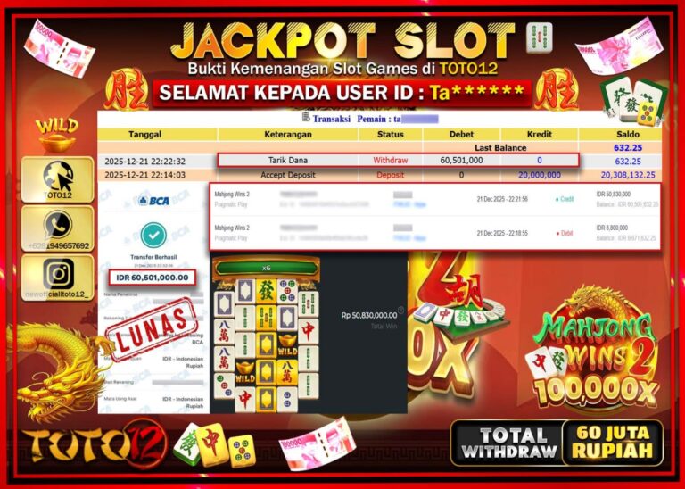 Selamat kepada Member Kami Ta****** Telah Jackpot dan berhasil mendapatkan kemenangan besar pada permainan JACKPOT SLOT GAME (MAHJONG WINS 2) Dengan Kemenangan Sebesar Rp.60.501.000 –. Setelah mengisi Fomulir Withdraw dengan Kurang waktu 1-2 Menit Dana sudah kami Trasnfer kepada Pemilik Userid dan dana sudah dapat di cairkan oleh pemenang. Bukti Pembayaran yang TOTO12 berikan merupakan Bukti…