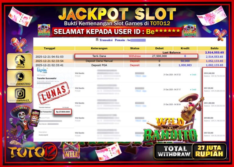 Selamat kepada Member Kami Be****** Telah Jackpot dan berhasil mendapatkan kemenangan besar pada permainan JACKPOT SLOT GAME (WILD BANDITO) Dengan Kemenangan Sebesar Rp.27.500.000 –. Setelah mengisi Fomulir Withdraw dengan Kurang waktu 1-2 Menit Dana sudah kami Trasnfer kepada Pemilik Userid dan dana sudah dapat di cairkan oleh pemenang. Bukti Pembayaran yang TOTO12 berikan merupakan Bukti Pembayaran…