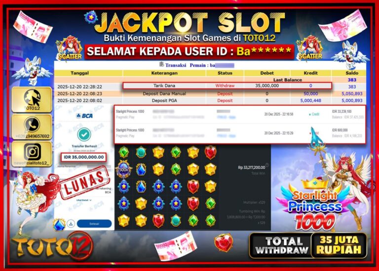 Selamat kepada Member Kami Ba****** Telah Jackpot dan berhasil mendapatkan kemenangan besar pada permainan JACKPOT SLOT GAME (STARLIGHT PRINCESS 1000) Dengan Kemenangan Sebesar Rp.35.000.000 –. Setelah mengisi Fomulir Withdraw dengan Kurang waktu 1-2 Menit Dana sudah kami Trasnfer kepada Pemilik Userid dan dana sudah dapat di cairkan oleh pemenang. Bukti Pembayaran yang TOTO12 berikan merupakan Bukti…