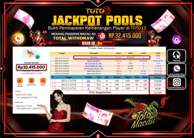 Selamat kepada Member Kami Bo****** Telah Jackpot dan berhasil mendapatkan kemenangan besar pada permainan JACKPOT POOLS PASARAN (MACAU 4D) Dengan Kemenangan Sebesar Rp.32.415.000 –. Setelah mengisi Fomulir Withdraw dengan Kurang waktu 1-2 Menit Dana sudah kami Trasnfer kepada Pemilik Userid dan dana sudah dapat di cairkan oleh pemenang. Bukti Pembayaran yang TOTO12 berikan merupakan Bukti Pembayaran…