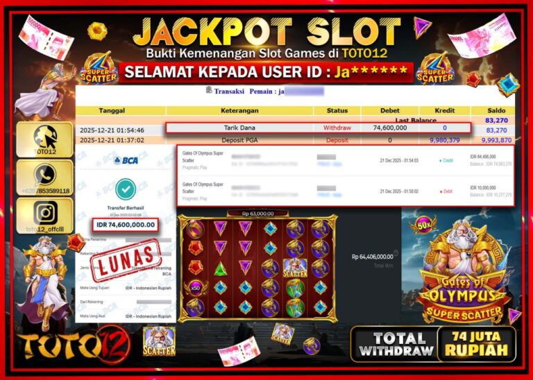 Selamat kepada Member Kami Ja****** Telah Jackpot dan berhasil mendapatkan kemenangan besar pada permainan JACKPOT SLOT GAME (GATES OF OLYMPUS SUPER SCATTER) Dengan Kemenangan Sebesar Rp.74.600.000 –. Setelah mengisi Fomulir Withdraw dengan Kurang waktu 1-2 Menit Dana sudah kami Trasnfer kepada Pemilik Userid dan dana sudah dapat di cairkan oleh pemenang. Bukti Pembayaran yang TOTO12 berikan…