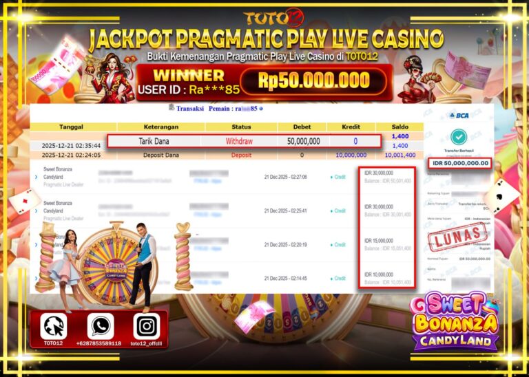 Selamat kepada Member Kami Ra****** Telah Jackpot dan berhasil mendapatkan kemenangan besar pada permainan JACKPOT PRAGMATIC PLAY LIVE CASINO (SWEET BONANZA CANDYLAND) Dengan Kemenangan Sebesar Rp.50.000.000 –. Setelah mengisi Fomulir Withdraw dengan Kurang waktu 1-2 Menit Dana sudah kami Trasnfer kepada Pemilik Userid dan dana sudah dapat di cairkan oleh pemenang. Bukti Pembayaran yang TOTO12 berikan…