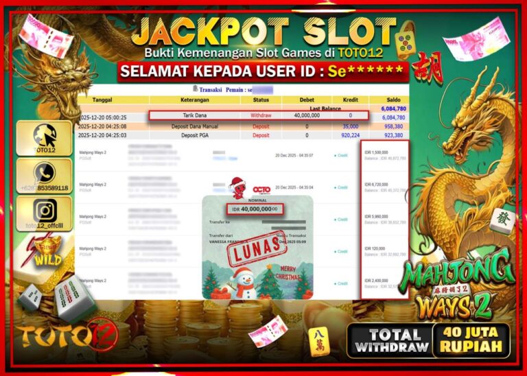 Selamat kepada Member Kami Se****** Telah Jackpot dan berhasil mendapatkan kemenangan besar pada permainan JACKPOT SLOT GAME (MAHJONG WAYS 2) Dengan Kemenangan Sebesar Rp.40.000.000 –. Setelah mengisi Fomulir Withdraw dengan Kurang waktu 1-2 Menit Dana sudah kami Trasnfer kepada Pemilik Userid dan dana sudah dapat di cairkan oleh pemenang. Bukti Pembayaran yang TOTO12 berikan merupakan Bukti…