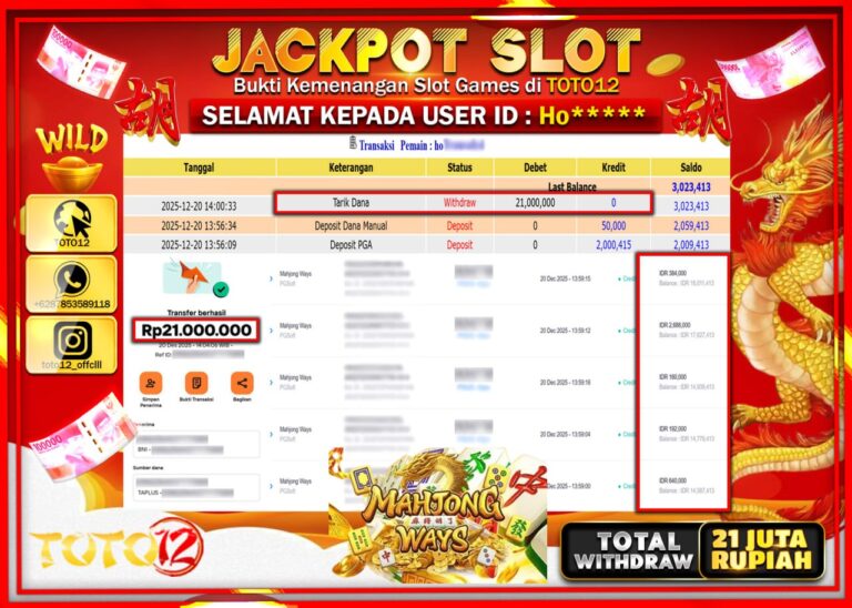 Selamat kepada Member Kami Ho****** Telah Jackpot dan berhasil mendapatkan kemenangan besar pada permainan JACKPOT SLOT GAME (MAHJONG WAYS) Dengan Kemenangan Sebesar Rp.21.000.000 –. Setelah mengisi Fomulir Withdraw dengan Kurang waktu 1-2 Menit Dana sudah kami Trasnfer kepada Pemilik Userid dan dana sudah dapat di cairkan oleh pemenang. Bukti Pembayaran yang TOTO12 berikan merupakan Bukti Pembayaran…