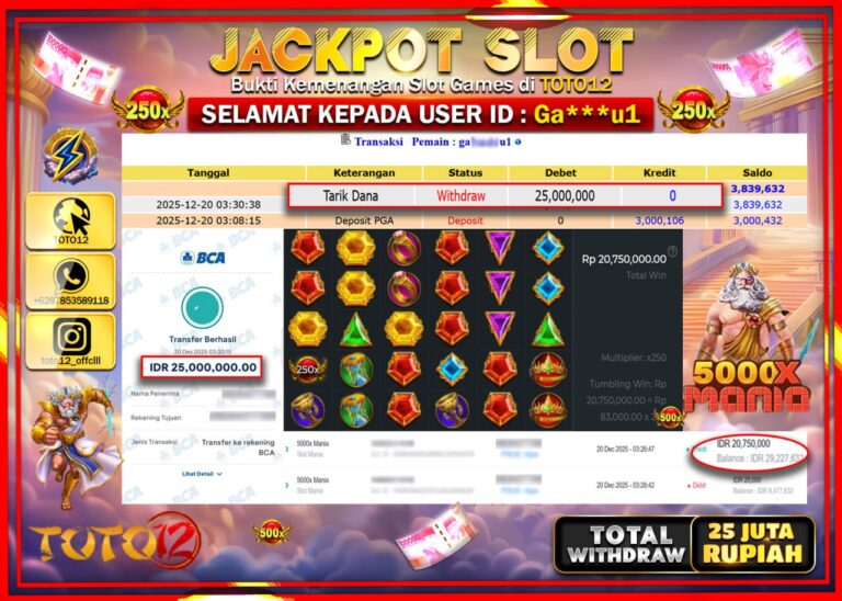 Selamat kepada Member Kami Ga****** Telah Jackpot dan berhasil mendapatkan kemenangan besar pada permainan JACKPOT SLOT GAME (5000X MANIA) Dengan Kemenangan Sebesar Rp.25.000.000 –. Setelah mengisi Fomulir Withdraw dengan Kurang waktu 1-2 Menit Dana sudah kami Trasnfer kepada Pemilik Userid dan dana sudah dapat di cairkan oleh pemenang. Bukti Pembayaran yang TOTO12 berikan merupakan Bukti Pembayaran…