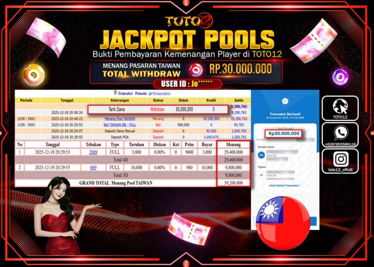 Selamat kepada Member Kami Je****** Telah Jackpot dan berhasil mendapatkan kemenangan besar pada permainan JACKPOT POOLS PASARAN (TAIWAN) Dengan Kemenangan Sebesar Rp.30.000.000 –. Setelah mengisi Fomulir Withdraw dengan Kurang waktu 1-2 Menit Dana sudah kami Trasnfer kepada Pemilik Userid dan dana sudah dapat di cairkan oleh pemenang. Bukti Pembayaran yang TOTO12 berikan merupakan Bukti Pembayaran yang SAH…