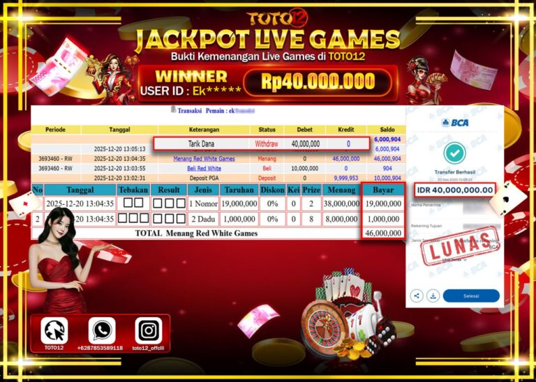HANYA DI TOTO12 JP PASTI DI BAYAR LUNAS DAN CEPAT!!!!!! JACKPOT LIVE GAMES (RED WHITE) Rp.40.000.000 !!!!