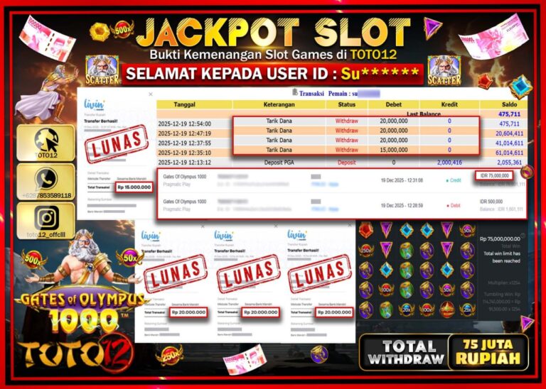 Selamat kepada Member Kami Su****** Telah Jackpot dan berhasil mendapatkan kemenangan besar pada permainan JACKPOT SLOT GAME (GATES OF OLYMPUS 1000) Dengan Kemenangan Sebesar Rp.75.000.000 –. Setelah mengisi Fomulir Withdraw dengan Kurang waktu 1-2 Menit Dana sudah kami Trasnfer kepada Pemilik Userid dan dana sudah dapat di cairkan oleh pemenang. Bukti Pembayaran yang TOTO12 berikan merupakan…