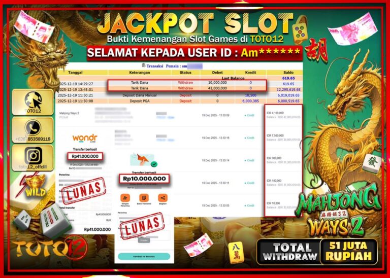 Selamat kepada Member Kami Am****** Telah Jackpot dan berhasil mendapatkan kemenangan besar pada permainan JACKPOT SLOT GAME (MAHJONG WAYS 2) Dengan Kemenangan Sebesar Rp.51.000.000 –. Setelah mengisi Fomulir Withdraw dengan Kurang waktu 1-2 Menit Dana sudah kami Trasnfer kepada Pemilik Userid dan dana sudah dapat di cairkan oleh pemenang. Bukti Pembayaran yang TOTO12 berikan merupakan Bukti…