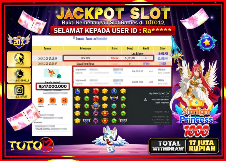 Selamat kepada Member Kami Ra****** Telah Jackpot dan berhasil mendapatkan kemenangan besar pada permainan JACKPOT SLOT GAME ((STARLIGHT PRINCESS 1000) Dengan Kemenangan Sebesar Rp.17.000.000 –. Setelah mengisi Fomulir Withdraw dengan Kurang waktu 1-2 Menit Dana sudah kami Trasnfer kepada Pemilik Userid dan dana sudah dapat di cairkan oleh pemenang. Bukti Pembayaran yang TOTO12 berikan merupakan Bukti…