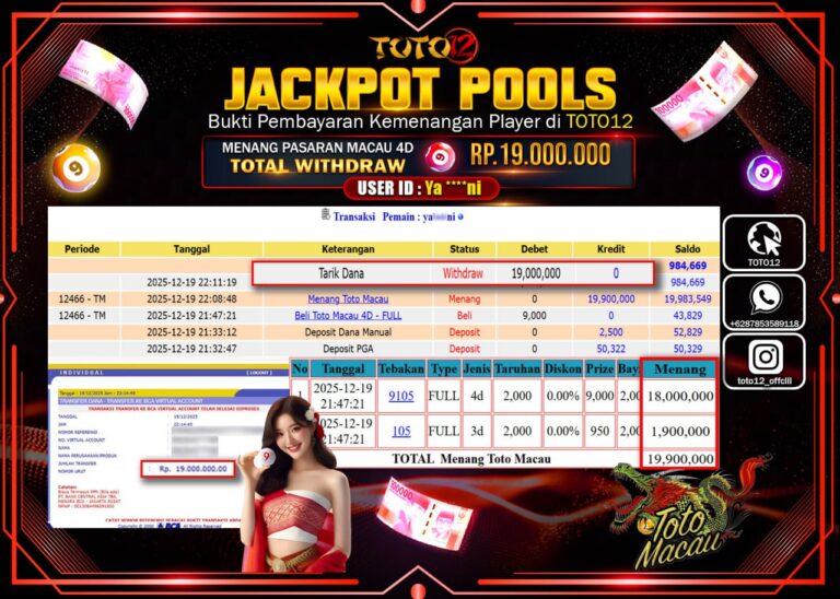 Selamat kepada Member Kami Ya****** Telah Jackpot dan berhasil mendapatkan kemenangan besar pada permainan JACKPOT POOLS PASARAN (MACAU 4D) Dengan Kemenangan Sebesar Rp.19.000.000 –. Setelah mengisi Fomulir Withdraw dengan Kurang waktu 1-2 Menit Dana sudah kami Trasnfer kepada Pemilik Userid dan dana sudah dapat di cairkan oleh pemenang. Bukti Pembayaran yang TOTO12 berikan merupakan Bukti Pembayaran…
